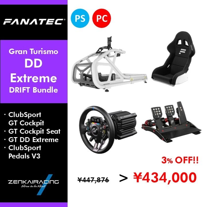 FANATECのレーシングコックピット『ClubSport GT Cockpit』と、PlayStation5対応の『Gran Turismo® DD Extreme』及び『ClubSport Pedals V3』を組み合わせた、このセットですぐにレーシングシミュレーターを始められるコックピットバンドルセットです。