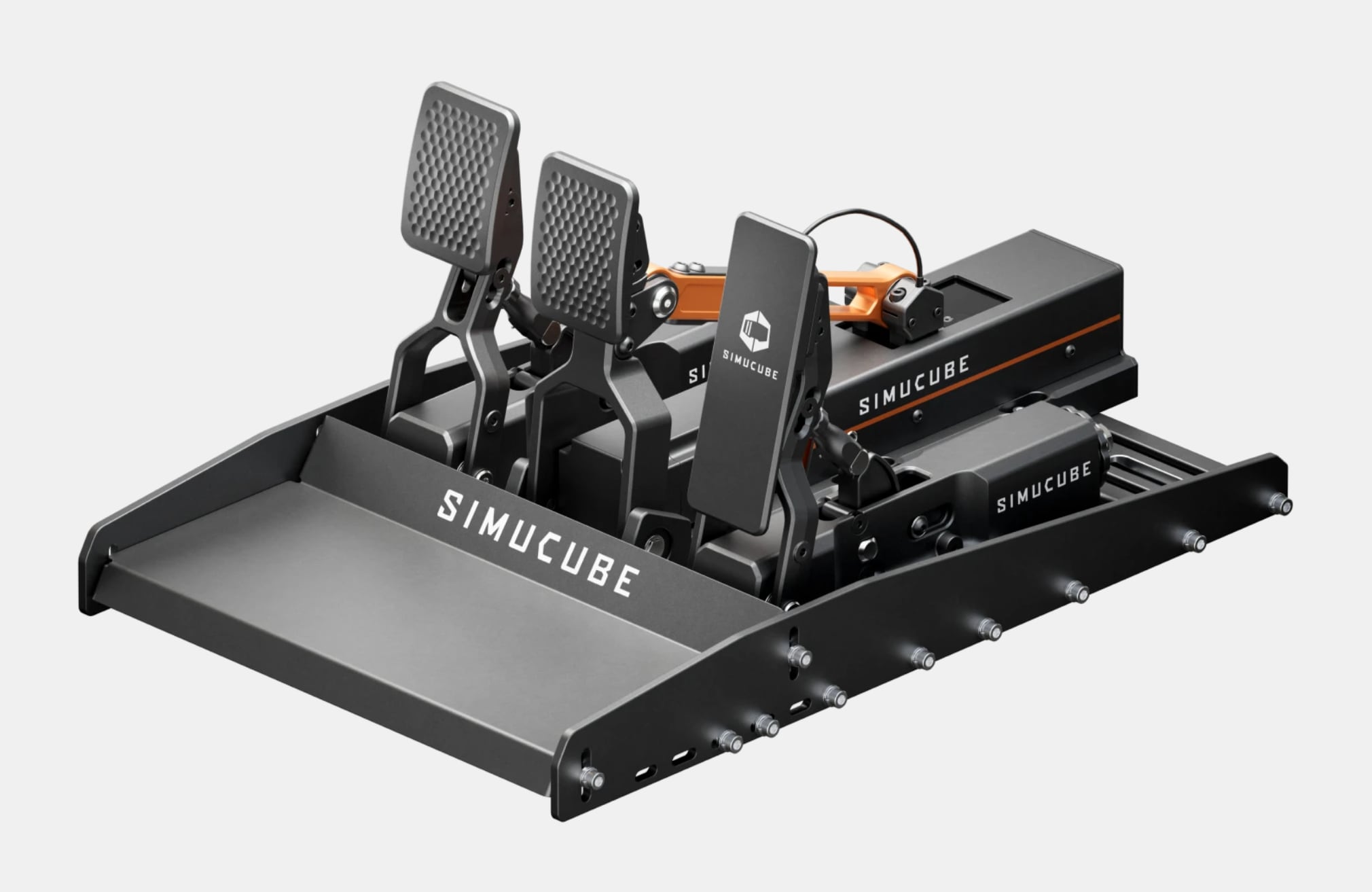 ゴム、ブッシュ、スプリングを使わない、モーター制御の『Active Pedal Ultimate』。それにスロットル・クラッチ用のSIMUCUBE Co-Pedal 2つ、その3つを固定するベースプレートをセットにしたバンドルパックです。
